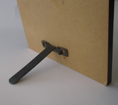 For a desktop alternative to artwork display, a long metal or wooden tab can be affixed to the bottom of the frame that allows the artwork to be displayed on a flat surface at a slightly reclined angle. This hardware is perfect for small plaque mounts, wood panel mounts, or face mounts.