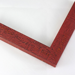 This textured frame features a distressed style and a desert-like finish. The face is a muted scarlet red with black texture marks and red-toned natural wood finish can been seen through the distressed surface.