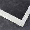 This stair step wood floater frame has a matte white finish with a steep upper and small lower step. The canvas will hover neatly within the simple, modern border.